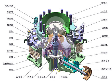 CS圓錐破碎機主要由機架、定錐總成、動錐總成、彈簧機構、碗型軸架部和傳動